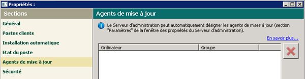 Un agent de mise à jour vous permet d’avoir un point de mise à jour pour tous les ordinateurs d’un groupe d’ordinateurs. Ainsi, tous les ordinateurs ne se connectent pas au serveur d’administration pour se mettre à jour mais, directement à l’agent de mise à jour de leur groupe qui a pour but de délivrer les mises à jour aux postes clients.