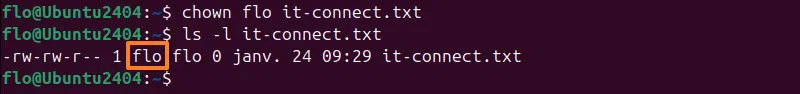 Pour changer le propriétaire d'un fichier appelé it-connect.txt et le définir à l'utilisateur flo :