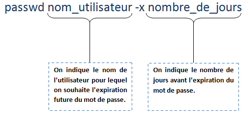 Dans le même esprit, on peut spécifier l'âge maximum d'un mot de passe afin d'être sûr que l'utilisateur le renouvèle conformément à la politique de mots de passe de l'entreprise. Cette fois-ci, c'est l'option "-x" qui sera utilisée. Voici la syntaxe à respecter :
