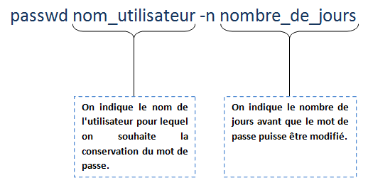 Avec la commande passwd, on peut définir un nombre de jours minimum avant que l'utilisateur puisse modifier son mot de passe. Autrement dit, on impose un âge minimum pour le mot de passe de cet utilisateur. C'est l'option "-n" de la commande passwd qui doit être utilisée. Voici la syntaxe à respecter :