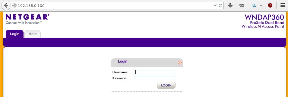 Passons à l'action, en suivant le guide d'installation, on connecte donc notre carte réseau Ethernet sur un des ports RJ 45 de la borne et on configure notre port Ethernet sur le réseau 192.168.0.x/24, notre borne sera elle joignable via l'IP 192.168.0.100 par défaut. On arrive ensuite via un navigateur sur le port HTTP (80) de notre point d'accès :