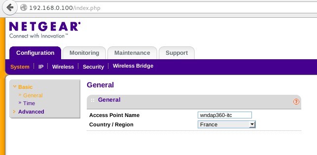 Le mot de passe par défaut est "password" et le login "admin", à changer de toute urgence ! Effectuons quelques opérations de base afin de nous familiariser avec l'interface. On commence par changer la langue ((le changement du pays est nécessaire afin de respecter la législation et les contraintes techniques locales, telles que les canaux autorisés) et le nom de l'appareil :