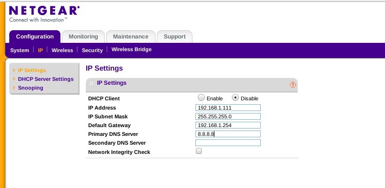 On pourra en profiter pour mettre notre borne WiFi dans notre LAN en allant dans le menu "Configuration" puis "IP" et enfin "IP Settings" :