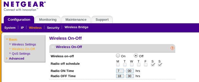 Après avoir cliqué sur "Apply", on pourra joindre à nouveau la borne WiFi sur sa nouvelle IP. On pourra ensuite aller voir du côté de la configuration WiFi, ici le panneau permettant de programmer le démarrage et l'arrêt de la couverture WiFi en fonction du jour et de l'heure :
