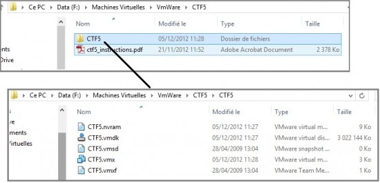 Dans le dossier « CTF5/CTF5 » on se retrouve avec les différents fichiers composants une machine virtuelle VmWare. Il nous suffit de cliquer sur le fichier « CTF5.vmx » pour lancer la machine virtuelle :