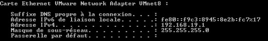 Les machines sous NAT partagent une plage IP de la carte réseau virtuelle de l’hôte qui se nomme « VMnet8 ». On peut voir cette configuration de plage IP lorsque l’on ouvre une invite de commande (sous Windows) et que l’on saisit la commande « ipconfig » :