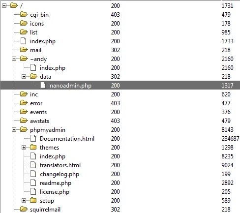 - Dans le "/home/andy" on remarque un dossier dont le nom peut faire penser à un dossier web "public_html ". On peut croiser cette information avec l’analyse DirBuster faite précédemment ou nous avions un dossier "~andy" ainsi qu’une page "nanoadmin.php" . "nanoadmin" n’est pas un nom de page courant. On peut faire une recherche sur internet pour voir si cela fait partie d’une application connue : http://lmgtfy.com/?q=nanoadmin+php+web