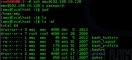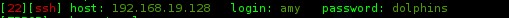 Hydra a donc trouvé une correspondance entre le login amy et le mot de passe dolphins. On peut donc tenter une connexion SSH avec ces identifiants