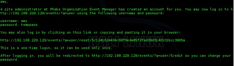 On connait le nom d’utilisateur « amy ». On le saisit puis on clique sur « E-mail new password ». On recevra alors un mail de réinitialisation de mot de passe sur le compte d’amy que nous pourrons voir avec la commande « mail » :