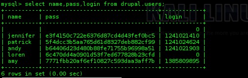 On remarque qu’il n’y a que “root” d’enregistré. Étant donné que nous nous sommes identifié avec « amy » sur le site précédemment. On peut imaginer que les utilisateurs sont dans une autre base mysql. On fouille un peu les différentes tables pour tomber sur drupal.users :