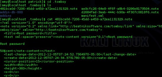 On remarque, entre autres, un dossier « tomboy ». En se renseignant un peu (http://lmgtfy.com/?q=linux+tomboy ) On voit que tomboy est une petite application de prise de note. Voyons ce que patrick a pu nous noter d’intéressant sur son bureau :