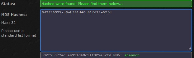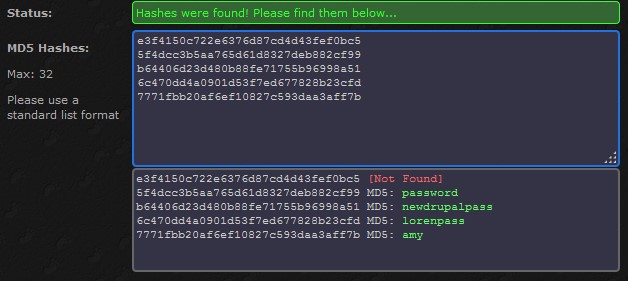 Nous avons à nouveau des mots de passe qui semblent être hashé en MD5. On reproduit la manipulation de tout à l’heure pour retrouver le message original d’un hash avec une rainbow table pour avoir ce résultat :