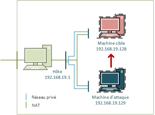 On voit donc que les machines virtuelles dans le réseau NAT seront dans la plage IP 192.168.19.0/24. On prendra donc soin de mettre la carte réseau de notre machine virtuelle d’attaque cible également en NAT.