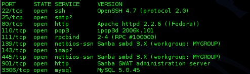 D’autres informations intéressantes sont récupérées sur le port 80 qui est le port par défaut web. On voit que la version du serveur web utilisé est Apache 2.2.6 le fait qu’il y soit indiqué "httpd" indique également que c’est une Fedora, Centos ou dérivée car sur ces distributions, le service Apache est nommé « httpd » :