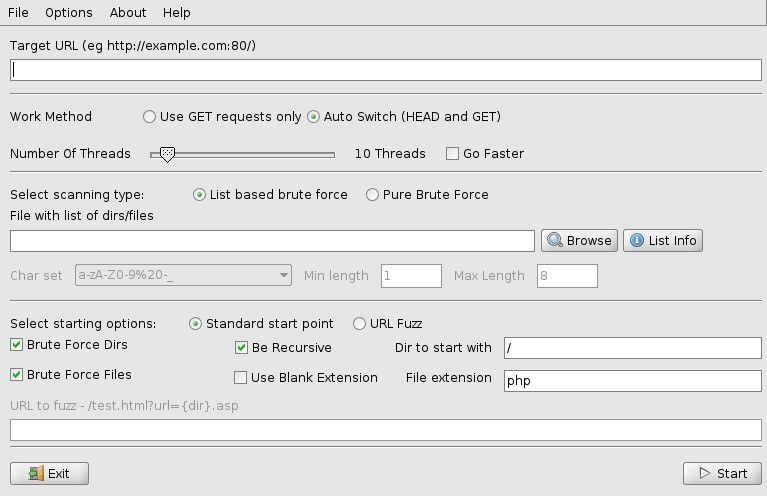 DirBuster va donc partir de la racine de notre serveur web et faire une recherche par brute force à partir de cette racine. Si nous souhaitions scanner une URL ou une application particulière, nous aurions aussi pu spécifier l’URL comme ceci