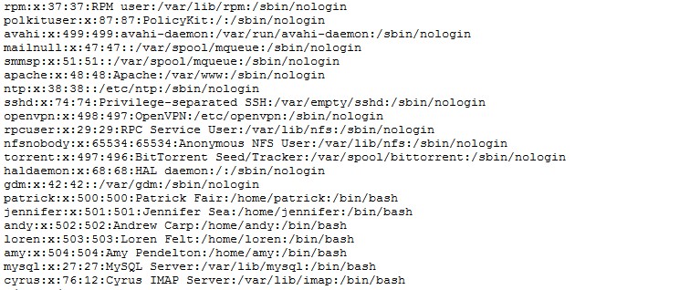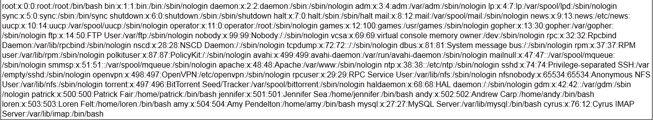 Le fichier "/etc/passwd" est le fichier contenant le nom de login de tous les utilisateurs du système. On voit aussi dans ce fichier lesquels on un droit d’accès en shell sur le serveur. Les utilisateurs ayant un accès shell deviennent donc des cibles pour un brute force SSH. Un brute force sur deux champs inconnus (login + mot de passe) est très très fastidieux. Pour qu’un brute force soit plus intéressant a faire, il nous faut ou moins l’un des deux champs, c’est ce que nous obtenons ici. On notera donc les nous d’utilisateurs suivants :