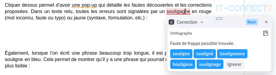 Cliquer dessus permet d’avoir un pop-up qui détaille les fautes découvertes et les corrections proposées. Dans un texte relu, toutes les erreurs sont signalées par un soulignage en rouge (mot inconnu, faute ou typo) ou jaune (syntaxe, formulation, etc.) :