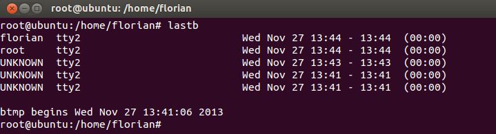 On peut voir que les tentatives infructueuses effectuées avec un utilisateur inconnue de la base locale sont indiquées avec "UNKNOWN" signifiant "INCONNU". Le numéro de terminal virtuel est également indiqué, par exemple "tty2" dans ce cas, suivit de la date et de l'heure.