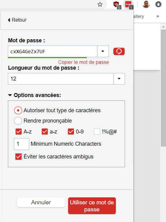 Afin de vous faciliter la tâche lorsque vous effectuez une inscription sur un nouveau site, LastPass peut générer un mot de passe à votre place, selon différents critères. Ce mot de passe, si vous l'utilisez, sera ensuite stockez dans votre coffre-fort pour le site en question ce qui est très pratique.