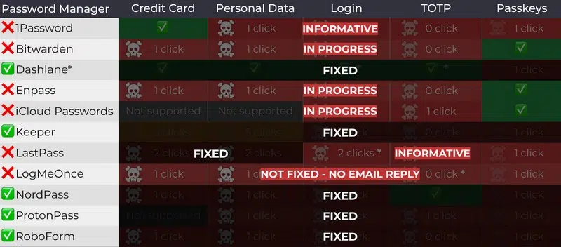 Une fois cette méthode mise au point, Marek Tóth a décidé d'évaluer les gestionnaires de mots de passe les plus populaires, afin de déterminer ceux qui sont vulnérables à cette attaque.