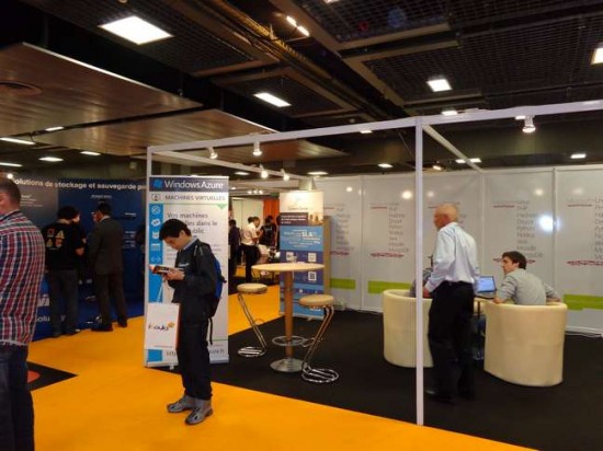 En effet, le premier stand que l’on trouve juste après l’entrée, c’est celui de Microsoft ou plutôt celui de Windows Azure...et c’est de loin le plus gros stand mais aussi le plus «vide». Seuls deux personnes trônent au milieu de quelques panneaux d’information vantant les mérites du cloud de la firme de Redmond et proposant même de s’y essayer gratuitement pendant trente jours en y faisant tourner vos systèmes Linux qui sont désormais «compatibles» dans ce cloud.