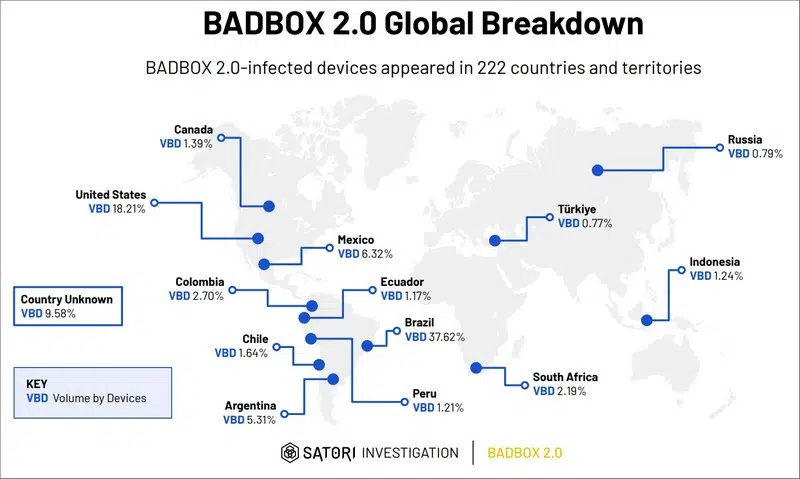 Le malware se propage à l’échelle mondiale, avec des pics d’infection observés au Brésil (37,6 %), aux États-Unis (18,2 %), au Mexique (6,3 %) et en Argentine (5,3 %). Malgré une nouvelle opération conjointe de neutralisation de BADBOX 2.0 dirigée par l’équipe de HUMAN, en partenariat avec Google, Trend Micro et The Shadowserver Foundation, plus de 500 000 dispositifs infectés restent actifs... Et la tendance repart à la hausse.