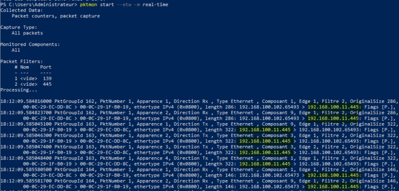 Pour finir, on peut réaliser une analyse de paquets depuis le "serveur SMB" pour vérifier que nous utilisons bien le port 445. Pour cette simple opération, inutile d'installer un outil tiers puisque nous allons utiliser Packet Monitor (intégré à Windows). Il s'utilise avec la commande pktmon.