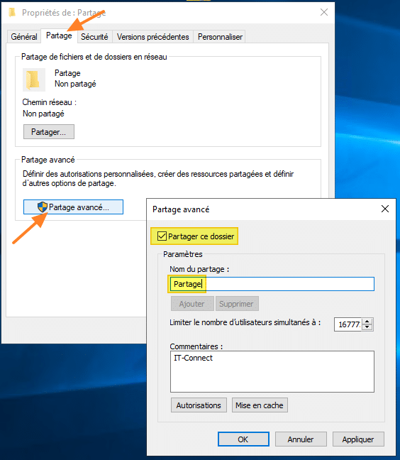 - Bien configurer les autorisations de partage + NTFS et tester l’accès pour éviter les mauvaises surprises (exposer des données).