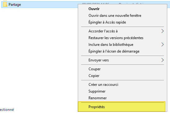 Sur le serveur Windows, commençons par créer le dossier à partager. Par exemple : C:\Partage. Ensuite, il faut accéder aux propriétés du dossier pour créer le partage : clic droit puis "Propriétés".