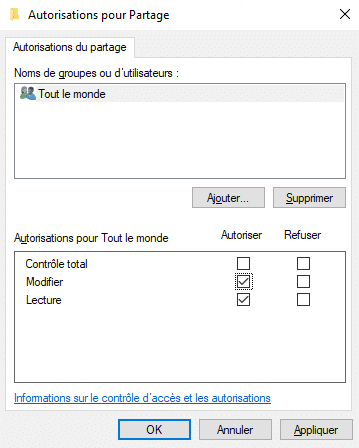 Si le groupe "Tout le monde" a les droits de lecture et d'écriture sur le partage, cela ne signifie pas que tout le monde peut accéder à votre partage et lire/modifier des fichiers. Cela dépend des autorisations définies sur le système de fichiers, que nous allons voir après.