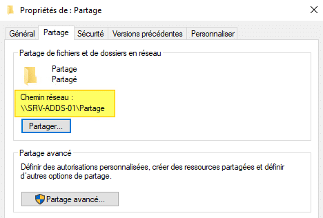 Validez... Désormais, c'est bien spécifié "Partagé". Le chemin réseau est également précisé : \\SRV-ADDS-01\Partage, ce qui correspond à : \\Nom-du-serveur\Nom-du-partage.