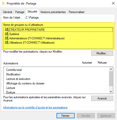 Basculez sur l'onglet "Sécurité" : c'est ici que s'affichent les autorisations du système de fichiers, autrement dit cela correspond aux droits NTFS (si vous utilisez le NTFS sur ce volume). Par défaut, on peut voir qu'il y a déjà des droits, et on voit aussi que tout le monde n'a pas les droits ! En l'occurrence ici, ce sont des groupes du domaine Active Directory "IT-CONNECT".