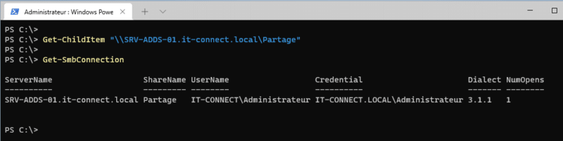 Ensuite, si vous relancez la commande Get-SmbConnection, vous allez voir la connexion SMB apparaître !