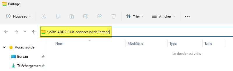 Ce type de chemin est appelé un chemin UNC pour Universal Naming Convention. Si votre collègue vous demande le chemin UNC pour accéder au partage, il faudra lui donner \\SRV-ADDS-01\Partage, mais préférez le chemin avec le nom DNS du serveur : \\SRV-ADDS-01.it-connect.local\Partage. Tout en sachant qu'un chemin UNC peut pointer vers un fichier ou un dossier directement, par exemple : \\SRV-ADDS-01.it-connect.local\Partage\Dossier1\MonFichier.txt.