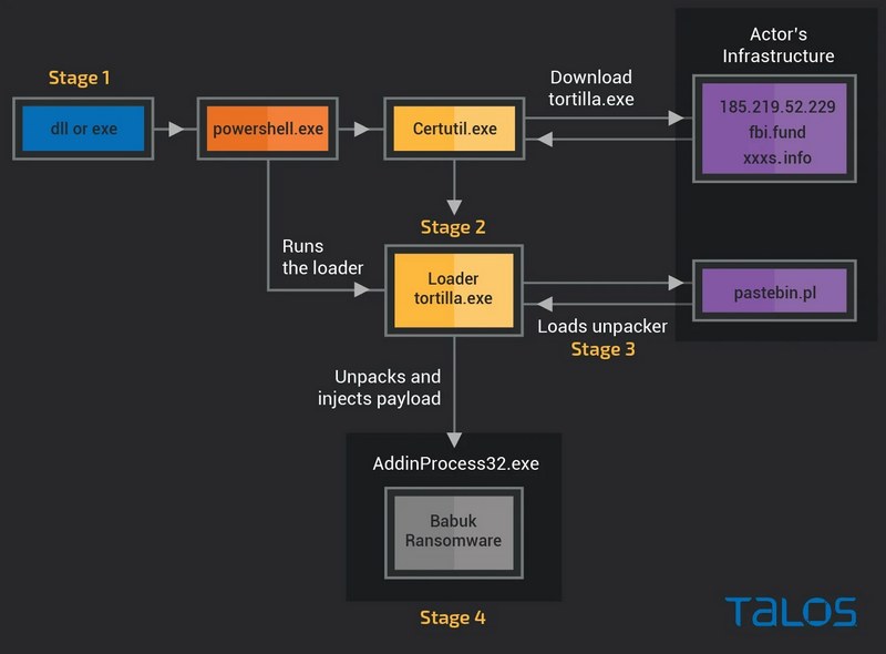 En premier lieu, le processus de mise en place du ransomware Babuk commence par s'attaquer au serveur Exchange en injectant une DLL ou un EXE malveillant sur le serveur de messagerie. Ce binaire est ensuite chargé par le processus "w3wp.exe" associé à IIS, puis il exécute une charge malveillante sur le serveur, en l'occurrence une commande PowerShell, et il termine par exécuter une requête Web pour récupérer "tortilla.exe" qui sera là pour exécuter d'autres payloads. Enfin, c'est le ransomware Babuk qui est exécuté pour chiffrer et exfiltrer des données.