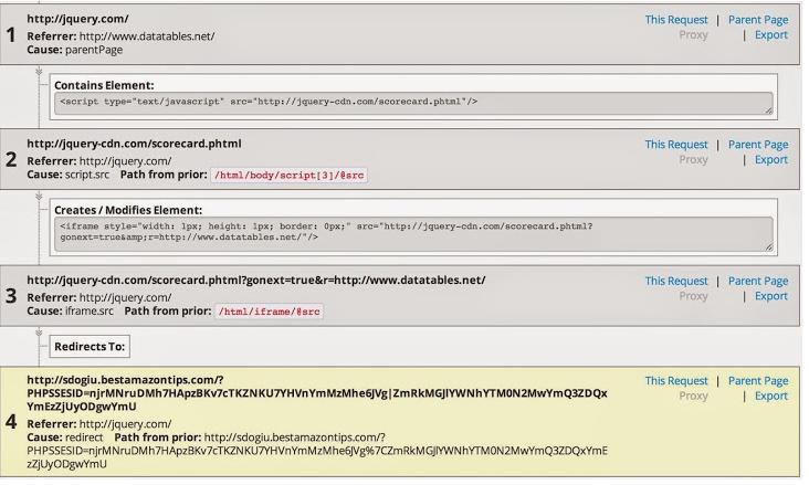 James Pleger de chez RiskIQ, a rapporté que l'attaque contre les serveurs web du site jquery.com a démarrée dans l'après-midi du 18 Septembre. Ainsi, les utilisateurs qui ont visité le site le 18 Septembre ont pu être infecté par un malware qui dérobe des données suite à la redirection de ces utilisateurs vers le site malveillant.