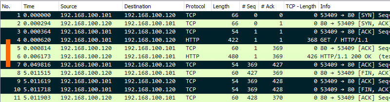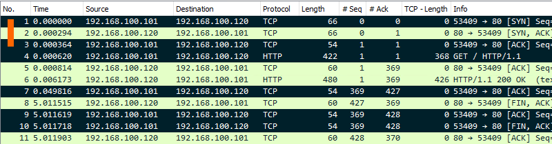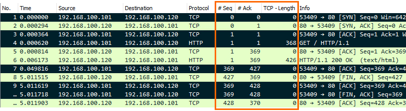 Voilà, un bon point de départ : Wireshark affiche désormais des informations indispensables pour permettre de suivre la connexion TCP. Même si ces informations sont visibles via la colonne "Info", c'est plus pratique de cette façon.