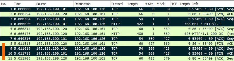 Le paquet n°9 correspond à la réponse du client afin de préciser que la demande de fermeture de connexion TCP a bien été reçue. Même si le serveur n'a pas envoyé de données, on peut voir que le numéro d'acquittement est passé de 427 à 428, soit +1. Sur le même principe qu'avec le flag SYN lors de l'initialisation de la connexion TCP, le flag FIN implique que le numéro d'acquittement soit incrémenté de 1.