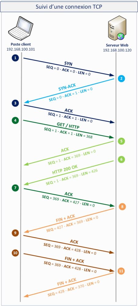 Il est à noter que les numéros de séquence et d'acquittement entre le client et le serveur sont différents. Le client gère son numéro de séquence et sa valeur évoluera en fonction des octets transférés dans le sens client vers serveur. Cela s'applique aussi au serveur pour les octets transférés dans le sens serveur vers client.
