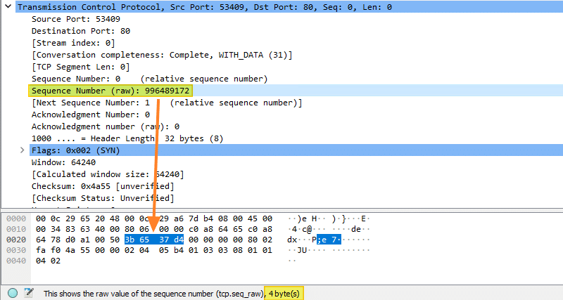 Ce numéro de séquence initial est généré aléatoirement par chaque hôte. Si l'on sélectionne les deux premiers paquets de notre trace ouverte dans Wireshark, et que l'on regarde l'en-tête TCP, on peut récupérer la valeur de l'ISN en regardant le champ "Sequence Number (raw)".