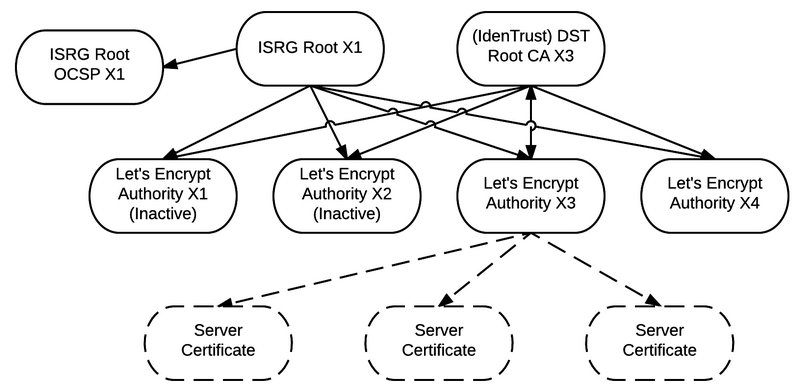 Le problème se situe au niveau d'un certificat racine, le certificat "ISRG Root X1" qui se situe tout en haut de la chaîne de certification de Let's Encrypt, comme l'illustre ce schéma issu de la documentation :