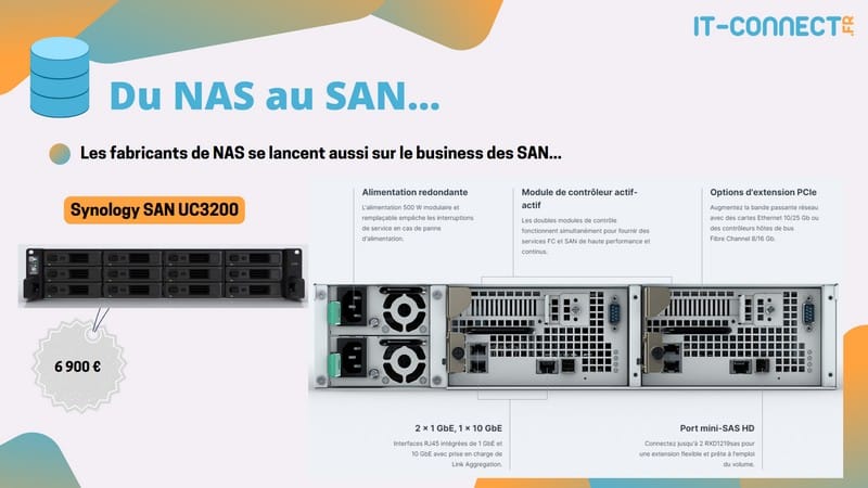 Certains fabricants de NAS se lancent à l'assaut du marché des baies SAN, comme Synology avec le modèle Synology SAN UC3200 qui reprend les codes habituels d'une baie SAN : double alimentation, cartes réseaux redondées, etc. Même si je n'ai pas de retour d'expérience particulier sur ce modèle, le prix de départ est quand même inférieur à une baie SAN chez les fabricants habituels, donc ça peut être une option à étudier de plus près !