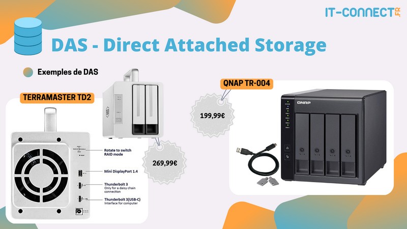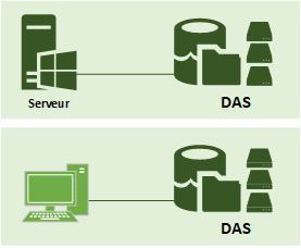 Commençons par le stockage DAS, qui est le moins populaire, mais qui mérite d'être connu. DAS signifie Direct Attached Storage, ce qui correspond à un appareil avec des disques physiques où le DAS est directement relié à un seul serveur ou un seul poste de travail. C'est important de retenir que la connexion s'effectue vers une machine unique.