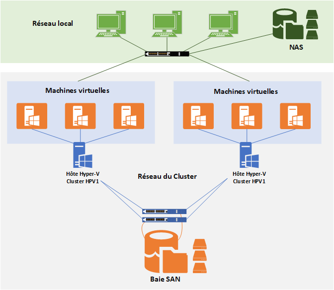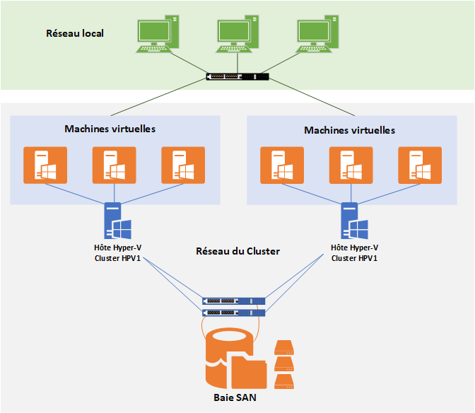 Très souvent, la baie SAN est utilisée comme stockage partagé pour héberger des machines virtuelles au sein d'un cluster d'hyperviseurs (Hyper-V, VMware ESXi, etc.), comme le montre l'image ci-dessous. Le stockage de la baie SAN n'est pas directement accessible par les ordinateurs connectés sur le réseau local. Seuls les serveurs connectés au stockage communiquent en direct avec les contrôleurs disques. En tant qu'administrateur, vous pouvez accéder à une interface de gestion en mode Web pour administrer la baie SAN (par exemple : créer un LUN).
