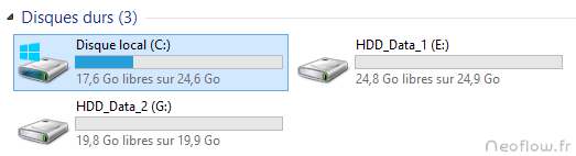Dans ce tutoriel, j’utiliserais une machine virtuelle ayant un disque dur (virtuel) principal où est installé Windows 8, et deux autres disques (virtuel) : un disque dur IDE (20Go) et un disque SSD (25Go), qui serviront à créer l’Espace de stockage.