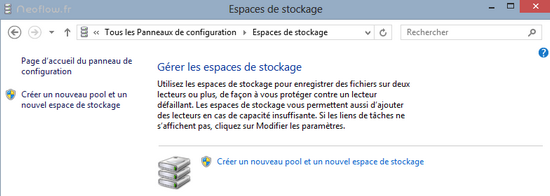 Une fois que vous êtes ici, cliquez sur « Créer un nouveau pool et un nouvel espace de stockage ». Un pool correspond à un groupement de disques.
