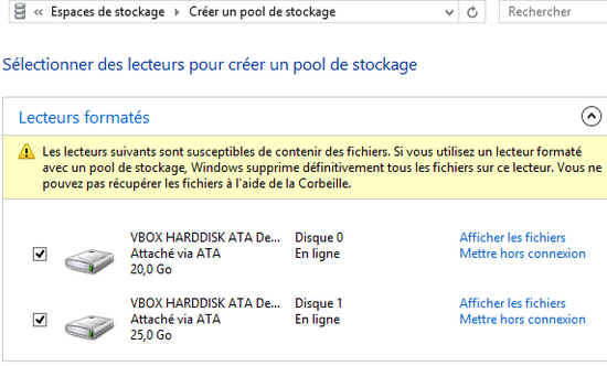 Vous devez sélectionnés les disques à utiliser pour créer le pool de stockage. Il est important de noter, que les disques sélectionnés seront formatés. Une fois que vous les avez sélectionnés, cliquez sur « Créer un pool ».