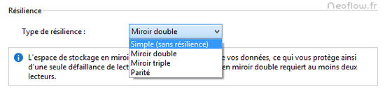 - Miroir double : L’Espace de stockage est créé avec vos volumes et il copie en double chacun des données c'est-à-dire qu’il fait un miroir des données (principe du RAID-1). Il requiert au minimum deux volumes pour être mis en place et divise par deux l’espace disque disponible à cause du miroir. Etant donné que les données sont écrites deux fois sur l’Espace de stockage, les performances sont diminuées contrairement à la sécurité de vos données qui est accrues (vous avez le droit à une défaillance).