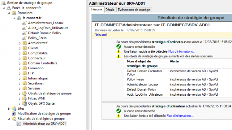 Par ailleurs, à partir de la console de Gestion de stratégie de groupe, nous avons une alternative à gpresult avec l’outil RSOP (Resultant Set Of Policy – Résultats de stratégie de groupe). C'est un outil intéressant pour tester l’application des GPOs à distance.