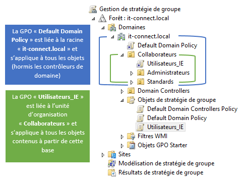 Dans la console de gestion des stratégies de groupe, les différentes GPO sont stockées dans un container nommé « Objets de stratégie de groupe ». Ensuite, chaque GPO est liée à une ou plusieurs OUs, ce qui crée des liens.